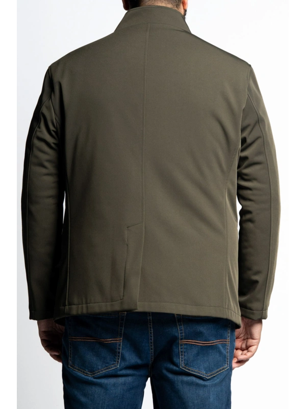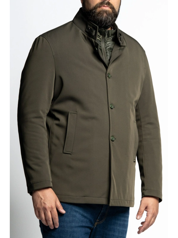 Topla rastezljiva prolazna jakna za jače figure s dva bočna i dva unutarnja džepa. Kapuljaču se može skinuti.
