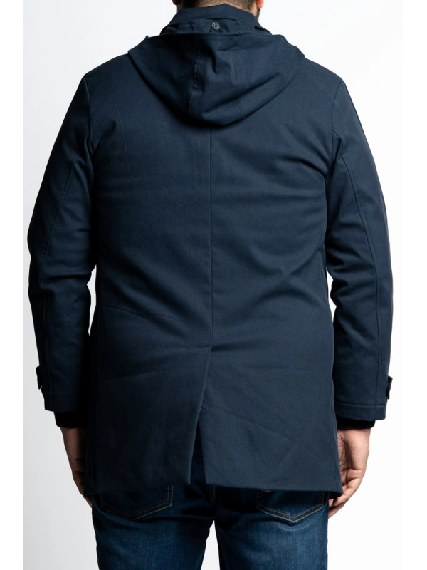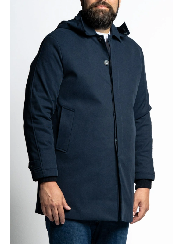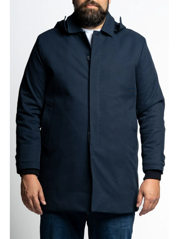 Topla rastezljiva prolazna jakna za jače figure s dva bočna i dva unutarnja džepa. Kapuljaču se može skinuti.
